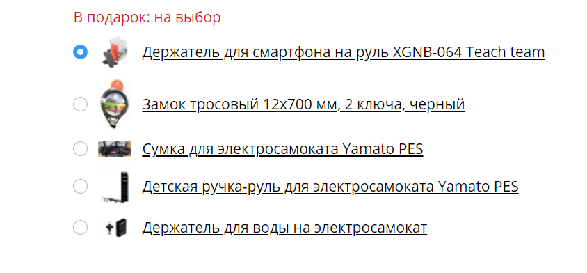 При покупке любого вида электротранспорта в Екатеринбурге мы дарим в подарок нужные аксессуары. Перечень подарков вы можете увидеть в карточке товара.